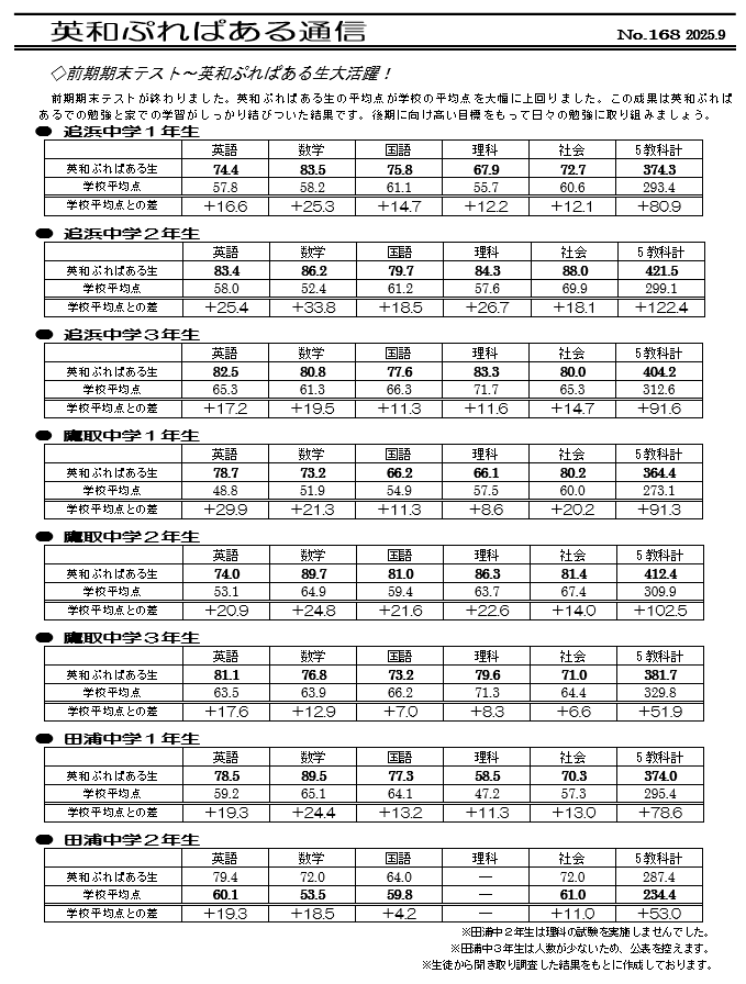 前期中間テストが終わりました。ぷれぱある生の平均点が学校の平均点を大幅に上回りました。